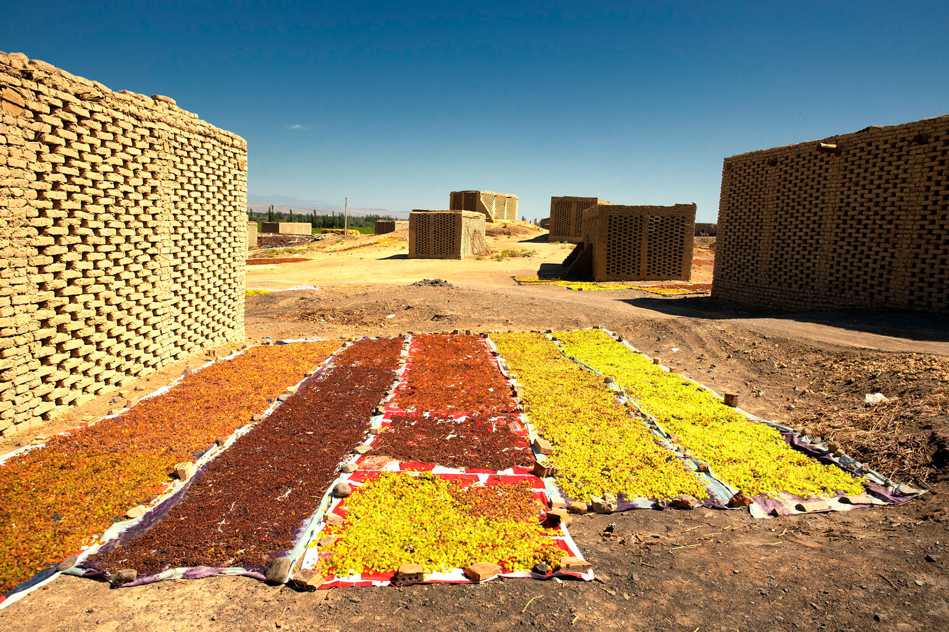 Grapes drying in a Turpan shed. Due to the very dry climate close to the Taklaman and Gobi deserts, and the abundance of grapes in the oasis of Turpan, drying grapes is a flourishing industry in Turpan